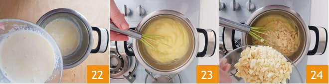 Transfira a mistura novamente para a panela 22 e leve à fervura, mexendo continuamente com um batedor manual, até que o creme engrosse 23. Desligue o fogo e adicione o chocolate branco picado 24, misture bem até que o chocolate esteja completamente derretido.