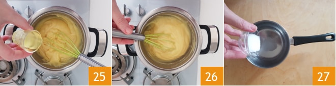 Adicione o limoncello 25, misture novamente até que esteja completamente incorporado 26. Transfira para uma tigela, cubra com filme plástico em contato e deixe esfriar, primeiro em temperatura ambiente e depois na geladeira. Enquanto isso, prepare também a calda: em uma panela, despeje a água e o açúcar 27 e aqueça no fogo até que esteja completamente dissolvido.