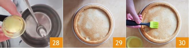 Desligue o fogo e adicione o limoncello 28. Quando todas as bases estiverem frias, retome a torta macia 29 e umedeça-a com a calda recém-preparada usando um pincel de cozinha 30.