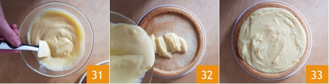 Retome o creme e trabalhe-o com uma espátula até que esteja liso 31. Transfira para o interior da torta 32 e nivele com uma espátula 33.