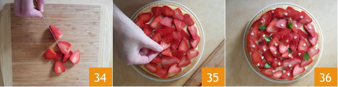 Lave bem os morangos, retire o talo e corte-os em fatias 34. Use-os para decorar a torta 35, decore com as gotas de chocolate e as folhinhas de hortelã 36. A torta macia com creme de chocolate branco e morangos está pronta: sirva-a ou conserve-a na geladeira.