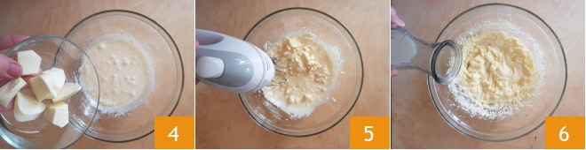 Adicione a manteiga amolecida em pedaços 4 e continue batendo 5 até obter uma massa lisa e homogênea. Neste ponto, adicione o leite à temperatura ambiente 6