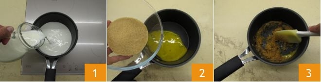 Para preparar a torta macia com creme, comece justamente pelo creme, pois ele precisará estar frio. Esquente o leite em uma panela 1. Enquanto isso, em outra panela, adicione as gemas e o açúcar mascavo 2, depois misture rapidamente com uma espátula até uniformizar o composto 3.