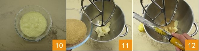 Misture tudo e transfira para uma tigela. Cubra com filme plástico em contato 10 e deixe esfriar primeiro em temperatura ambiente, depois na geladeira por 1 hora. Quando o creme estiver frio, você pode começar a fazer a massa frola. Coloque em uma batedeira equipada com pá a manteiga fria em cubos e o açúcar mascavo 11. Adicione as raspas de limão raladas 12