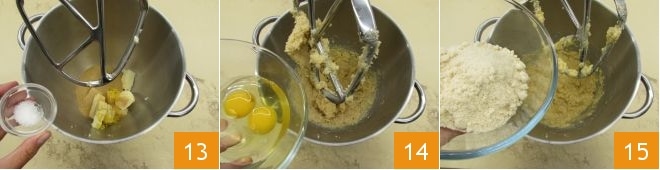 e o sal 13. Trabalhe tudo com a pá e quando tiver obtido um creme macio, adicione também os ovos, um de cada vez 14. Quando eles estiverem bem absorvidos, você pode adicionar a farinha de amêndoas 15,
