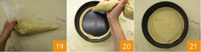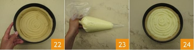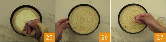 Transfira para um saco de confeitar sem bico 19 e use para fazer círculos concêntricos na base de uma forma de 22 cm com fundo removível (20-21).