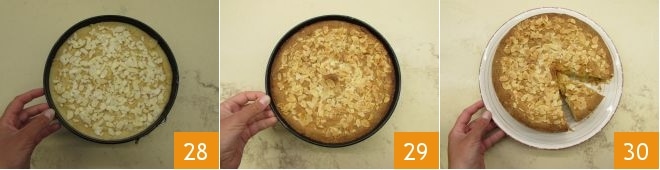 e decore com as amêndoas em lâminas 28. Asse em forno pré-aquecido a 180°C, na prateleira central por cerca de 50 minutos até que esteja bem dourada. Depois, retire do forno 29 e deixe esfriar completamente antes de desenformar e servir sua torta macia com creme 30.