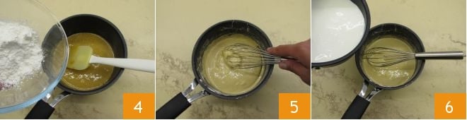 Em seguida, adicione também o amido de milho 4 e trabalhe tudo primeiro com a espátula e depois com um batedor 5. Quando o leite estiver quente, despeje-o dentro do composto de gemas, açúcar e amido de milho, pouco a pouco, mexendo continuamente com o batedor 6.