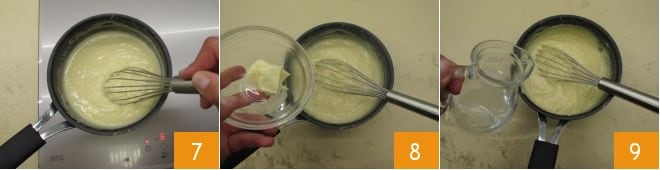 Quando tiver obtido um composto uniforme, coloque tudo de volta no fogo e mexa até que comece a ferver e o creme engrosse 7. Fora do fogo, adicione então a manteiga 8 e o rum 9.