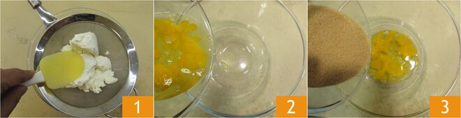 Para preparar a torta mágica de ricota, primeiro coloque a ricota de ovelha para escorrer 1, assim não soltará líquido durante o cozimento. Despeje os ovos ligeiramente batidos em uma tigela ampla 2, adicione o açúcar mascavo 3.