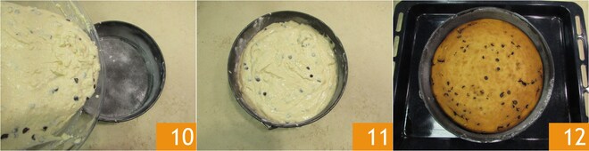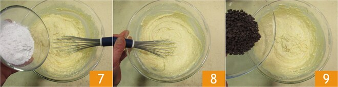 Agora incorpore também o amido de milho 7. Continue misturando com o batedor até obter uma massa homogênea 8. Adicione as gotas de chocolate 9 e misture com uma espátula para incorporar.
