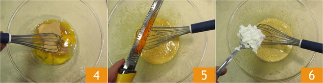 Comece a trabalhar com o batedor manual 5. Adicione as raspas de laranja 5 e vá adicionando a ricota aos poucos com uma colher 6.