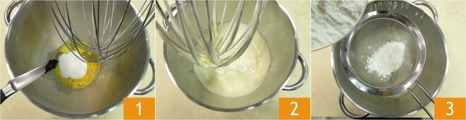 Para preparar o bolo mimosa sem glúten, coloque na tigela da batedeira os ovos, o açúcar e as sementes da vagem de baunilha 1. Reserve a vagem vazia, será usada posteriormente. Ligue a máquina e trabalhe os ingredientes com o batedor de arame por cerca de 10 minutos até obter uma mistura espumosa 2. Neste ponto, peneire o amido de milho peneirado