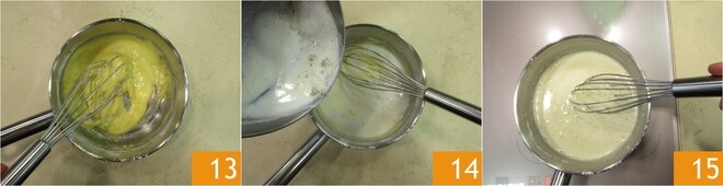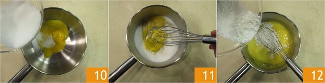 Enquanto isso, despeje as gemas e o açúcar em outra panela 10, mexa bem com um batedor 11 até obter uma mistura homogênea. Adicione também o amido de milho 12