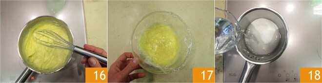 até que o creme engrosse 16, levará poucos minutos. Transfira o creme de confeiteiro para uma tigela, cubra com filme plástico em contato direto 17 e deixe esfriar primeiro à temperatura ambiente, depois na geladeira por uma hora 17. Prepare agora a calda. Despeje o açúcar e a água em uma panela 18.
