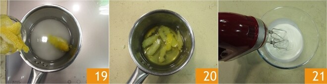 Adicione também a casca de limão 19 e leve a ferver no fogo. Deixe ferver em fogo baixo por 3 minutos. Em seguida, retire do fogo e deixe esfriar à temperatura ambiente. Quando o creme estiver bem frio, bata 300 g de creme de leite fresco usando o batedor elétrico 21.