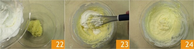 Retire 150 g de chantilly e adicione ao creme 22. Guarde o restante na geladeira. Misture com um batedor manual delicadamente 23 até obter um creme homogêneo 24.