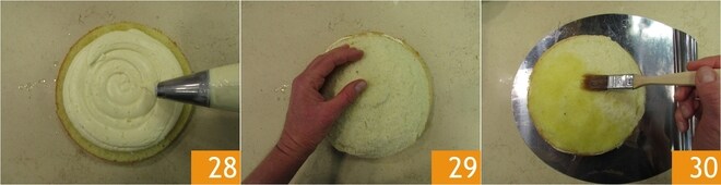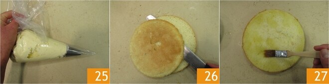 Transfira-o para um saco de confeitar 25. Pegue um dos pãos de ló e corte-o ao meio usando uma faca longa serrilhada 26. Mergulhe um pincel de cozinha na calda e use-o para molhar a base do pão de ló 27.