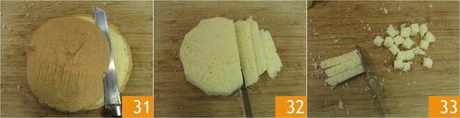 Pegue o segundo pão de ló e, usando uma faca longa serrilhada, corte-o completamente, para eliminar as partes escuras 21. Depois, corte fatias de 1 cm de espessura 32. Destas, corte tiras de 1 cm e, por último, corte cubos de 1x1 cm 33.