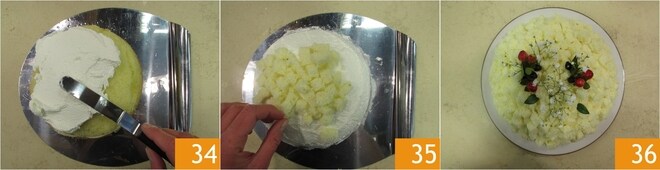 Pegue o chantilly reservado e use-o para cobrir todo o bolo, ajudando-se com uma espátula 34. Em seguida, cubra com os cubos de pão de ló, fazendo-os aderir bem ao chantilly 35 e decore com flores frescas comestíveis 36.