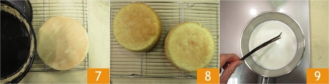 e vire-os ainda quentes sobre uma grade 7. Retire delicadamente o papel manteiga e deixe esfriar por 1 hora à temperatura ambiente. Enquanto isso, prepare o creme de confeiteiro. Despeje o leite em uma panela e adicione a vagem de baunilha previamente esvaziada 9. Aqueça no fogo até ferver.