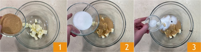 Para preparar a torta mousse de chocolate amargo sobre base sablé, comece pela base: em uma tigela, coloque a manteiga salgada, o açúcar mascavo 1, o açúcar refinado 2, as sementes da fava de baunilha e o sal 3.