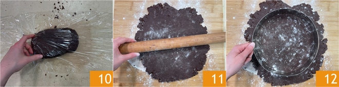 Forme uma massa, envolva-a em filme plástico 10 e coloque na geladeira por 1 hora. Retome a base e abra-a com um rolo até uma espessura de 3 mm 11, corte com um aro de 22 cm 12.
