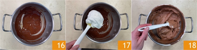 Quando atingir a temperatura de 45°C 16, adicione o creme de leite semi batido 17 de uma vez, misture primeiro com o batedor e depois com a espátula 18.