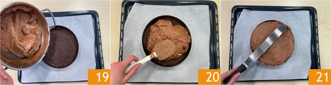 Coloque novamente o aro sobre a base sablé, para que a torta mantenha sua forma, em seguida despeje a mousse 19, distribuindo uniformemente 20, e nivele com a espátula 21. Transfira para a geladeira por duas horas.