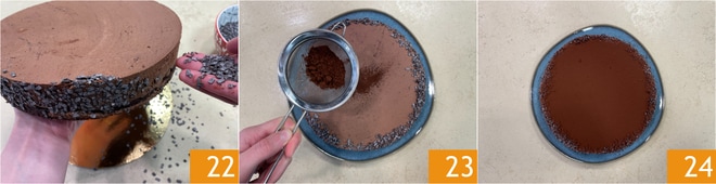 Recupere a torta firmada, retire o aro e cubra-a lateralmente com as lascas de chocolate 22. Polvilhe a superfície com cacau 23 e sua torta mousse de chocolate amargo com base sablé está pronta para ser saboreada 24.
