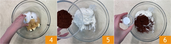 Misture para formar uma massa 4 e em seguida adicione também a farinha, o cacau em pó 5 e o bicarbonato 6.