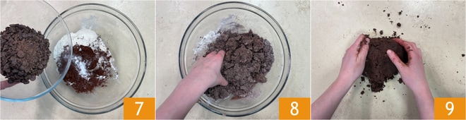 Acrescente o chocolate em lascas 7 e misture 8, junte os ingredientes e transfira para uma superfície de trabalho 9.