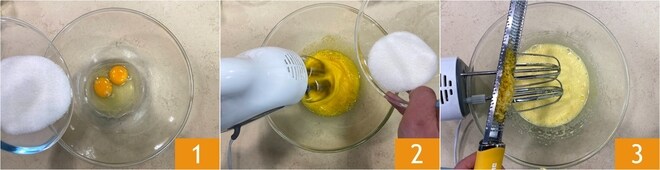 Para preparar o bolo na frigideira, a primeira coisa a fazer é colocar em uma tigela os ovos e cerca de metade do açúcar 1. Comece a bater com a batedeira elétrica e vá adicionando o restante do açúcar gradualmente 2. Continue batendo até que os ovos fiquem claros e espumosos. Adicione então a casca ralada do limão 3.