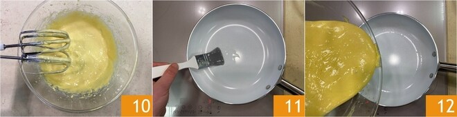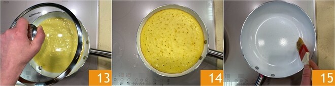 Assim que a farinha e o fermento estiverem bem misturados, desligue a batedeira 10. Agora unte com óleo de sementes uma frigideira de 20 cm na base e 24 cm na superfície e aqueça em fogo baixo; se usar placas de indução, ajuste para 3. Se usar o fogão a gás, siga as instruções de cozimento indicadas no conselho. Certifique-se de que a frigideira esteja bem untada em toda a superfície, depois despeje a massa dentro 12.