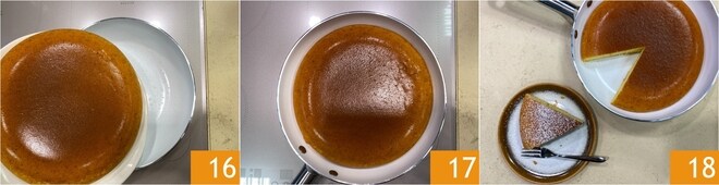 Deslize o bolo para dentro da frigideira 16 e deixe cozinhar por mais 15 minutos, sempre na mesma temperatura, mas desta vez sem tampa 17. Uma vez cozido, deixe esfriar, polvilhe com açúcar de confeiteiro e sirva seu bolo na frigideira 18!