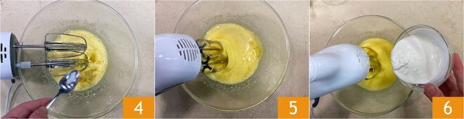 Acrescente uma pitada de sal 4 e misture com a batedeira 5. Adicione então o iogurte 6 e misture novamente até que esteja bem incorporado.