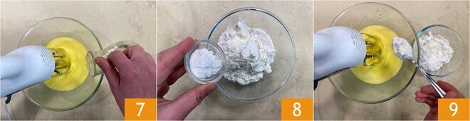 Agora diminua a velocidade da batedeira e despeje lentamente o óleo em fio 7. Em uma tigelinha, misture a farinha com o fermento 8 e peneire-os. Aos poucos, incorpore os ingredientes secos à massa, sempre com a batedeira em baixa velocidade 9.