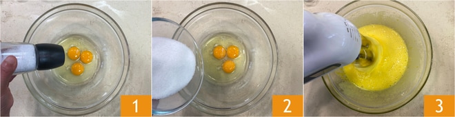 Para preparar a torta Nua de figos, a primeira coisa a fazer é quebrar os ovos em uma tigela, adicionar uma pitada de sal 1, o açúcar 2 e bater com a batedeira elétrica 3.