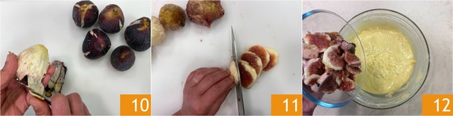Descasque os figos 10, corte-os em pedaços 11 e adicione-os à massa 12.