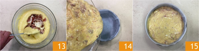 Incorpore-os misturando bem 13. Despeje a massa em uma forma de 20 cm de diâmetro, coberta com papel manteiga 14 e nivele a superfície 15.