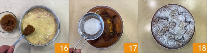 Na superfície, adicione a geleia de figos 16, então asse em forno ventilado pré-aquecido a 180° por cerca de 60 minutos. Uma vez assada, deixe esfriar no forno desligado, com a porta entreaberta, por 5 minutos. Desenforme e deixe esfriar completamente. Decore com açúcar de confeiteiro 17. A torta Nua de figos está pronta para ser saboreada 18.