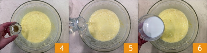 Adicione o extrato de baunilha 4, o óleo de girassol 5 e o leite 6. Misture para incorporar os ingredientes.