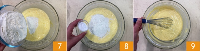 Adicione então a farinha 7 e o fermento 8 previamente peneirados. Misture com um batedor de mão 9 até obter uma massa homogênea e sem grumos.