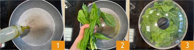 Para preparar a torta pasqualina fácil, comece pelas acelgas: aqueça um fio de óleo em uma ampla frigideira antiaderente 1, adicione as acelgas 2 e cubra com a tampa 3.