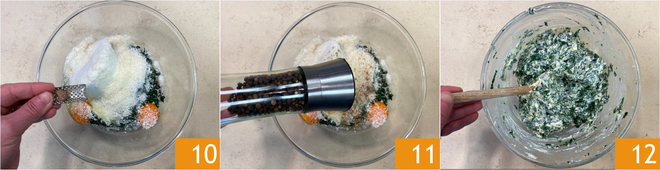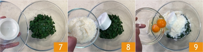 Para o recheio verde: transfira as acelgas picadas para uma tigela, depois junte a ricota 7, o queijo ralado 8 e os ovos 9.