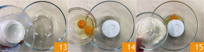 Passe para o recheio branco: em outra tigela coloque a ricota 13, os ovos 14 e o queijo ralado 15.