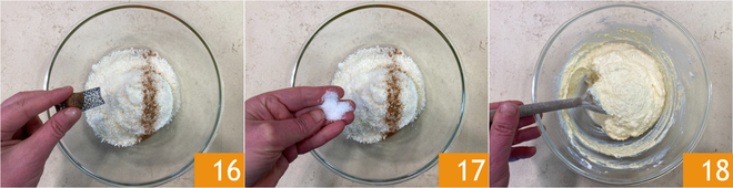Acrescente a noz‑moscada 16, sal 17 e pimenta, depois misture tudo 18.