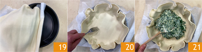 Você está pronto para montar a torta: desenrole a massa folhada e posicione-a com o papel manteiga dentro de uma forma com 20 cm de diâmetro na base e 24 cm na superfície 19. Fure a base com um garfo 20, depois distribua uniformemente o recheio verde 21.