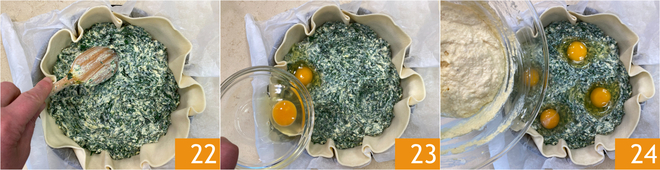 Com o cabo de uma colher faça 4 cavidades 22, depois coloque um ovo inteiro dentro de cada uma 23; para evitar que quebrem, recomendamos quebrar os ovos à parte. Agora adicione o recheio branco 24.