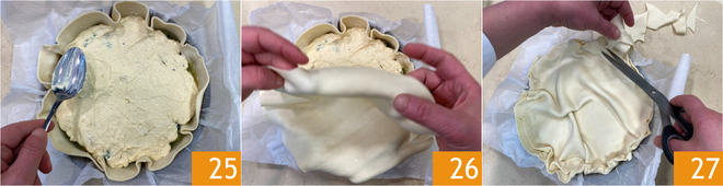 Nivele delicadamente o creme 25, depois cubra com o segundo rolo de massa folhada 26 e remova o excesso com uma tesoura 27.